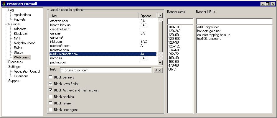 This window allows to setup WebGuard actions for specific web sites, as well as banner sizes and URLs.