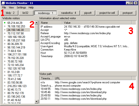 - A list of pages loaded by visitor. Search engine query is shown as well, if available. All data is shown in real time.